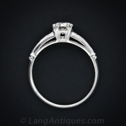 A timelessly classic estate diamond engagement ring with a stunning .50 carat transitional-cut diamond claw set at its center. This sparkler is highlighted on each side by four twinkling single cut diamonds, all set in a sleek platinum mounting.