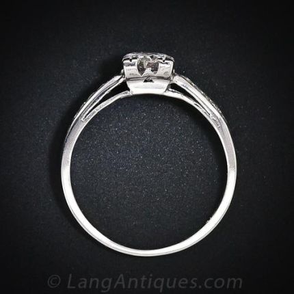 This no-nonsense, high-quality, vintage diamond engagement ring is crafted in platinum and dates back to the 1930s. The high color, superior quality, half carat transitional-cut diamond is simply presented with a row of tiny channel-set diamonds along each side with an expertly milgrained finish. Chic and sophisticated.