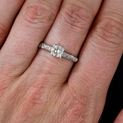 Classic Deco style is persistent, as this lovely circa 1950 platinum engagement ring can attest. Featuring a bright and blazing half-carat European-cut diamond that is square-set and attended by diamond-studded milgrained shoulders that terminate in carved, curling flourishes. A charmer! Finger size 8 1/2.
