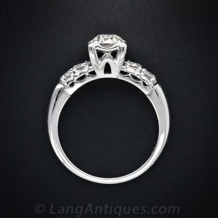 This classic mid-century diamond engagement ring features a .52 carat European cut diamond set in an "illusion" style mounting. The sparkling center diamond is flanked on each side by two transitional cut diamonds, at set in gleaming 14 karat white gold.