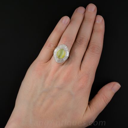 A crystalline, luminous and mesmerizing gemstone, a 7.55 carat chrysoberyl cat's-eye imbued with a sweet greenish honey color and exemplary chatoyancy (the sharp white cat's-eye) winks at you night and day from the center of a gorgeous ballerina style mounting composed of 48 icy-white, high-clarity, seamlessly-set tapered baguette diamonds, and an inner frame of small round brilliant-cut diamonds, all of which create a sparkling, exotically stunning mirror-like effect. Magnifique! 1.72 carats total diamond weight. The top measures 1 inch by 13/16 inch, currently ring size 6 3/4.