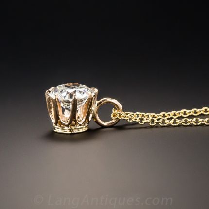 Understated elegance meets extravagant sparkle in this vintage drop featuring a solo performance by a bright and beautiful European-cut diamond weighing .70 carat. The bright white, high-quality diamond, dating from the early twentieth century, beams brilliantly from within its original 18K rosy-yellow gold 8-prong setting. The new chain measures 18 inches.