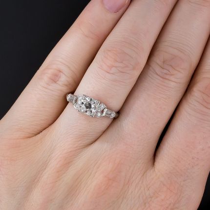 This stunning and sophisticated Art Deco engagement ring, hand-crafted in platinum - circa 1920s-30s - sizzles with a three-quarter-carat European-cut diamond. The dynamic diamond is set in a four-cornered setting between artfully designed epaulets, each of which is composed of a pair of straight baguette diamonds and tiny European-cut stones. The centerstone is accompanied by a European Gemological Laboratory certificate stating: G/H color - SI1 clarity, however, our in-house AGA accredited gem lab has ascribed a more conservative color grade of I. In a finger size 7 1/4.