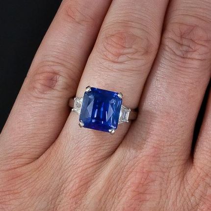 A magnificent, 8.22 carat velvety blue sapphire (not too light, not too dark) with an almost square, or scissor-cut is classically presented in platinum between a shimmering pair of trapezoid diamonds. A simply stunning and sophisticated jewel guaranteed to produce a smile with every glance.