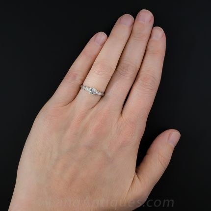 This sleek and sparkling vintage engagement ring highlights a .77 carat old mine-cut diamond presented in an elegantly tailored white gold mounting with a graduated trio of small single-cut diamonds enlivening each tapered shoulder. The central diamond dates from the early 1900s, and the mounting was crafted during the mid-twentieth century - probably the 1950s - culminating in a very lovely, classic engagement ring at a bargain price.