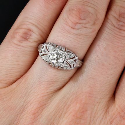 A bright and lively European-cut diamond, weighing .83 carat and dating back to the 1930s, has found a new home in a recently made platinum and diamond engagement ring mounting. The beautiful ring is fashioned in classic Art Deco style and is artfully beveled on each side with 16 tiny old mine-cut diamonds set in individual geometric settings finished with fine milgraining. From a polite distance, the center diamond appears to be all of one carat due to its sculptural four-cornered setting, and despite the I1 clarity grading, the inclusions are colorless, and unless you posses super vision the diamond is eye-clean. A decoratively embossed ring shank completes the pretty picture.