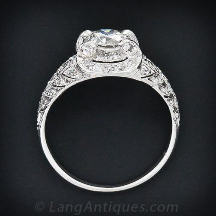 This gorgeous vintage diamond engagement ring, crafted in platinum circa 1920, exudes consummate Art Deco design details. The bright and beautiful center diamond weighs .83 carats and is held in place with graceful diamond-set prongs which seamlessly emerge from the mounting. The sides of the mounting evince a sparkling stylized feathered motif. A sublime original antique engagement ring in a finger size 5 1/4.