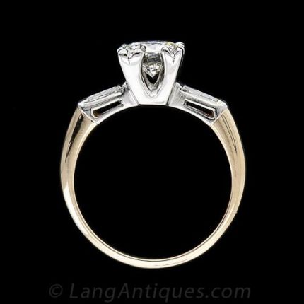 Shining front and center in this vintage two-tone engagement ring, circa 1940s-1950s, is a brilliant transitional-cut diamond weighing .87 carats. The stone stands high and sits securely in a squared-off setting with triple-split prongs at the corners, adding extra dimension to the diameter of the diamond. A pair of tapered baguette diamond epaulets, set in platinum, transition into a yellow gold shank. A timeless classic.