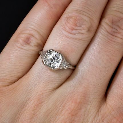This definitively Art Deco jewel, circa 1920s-30s, presents a bright and sparkling European-cut diamond, measuring .90 carats, set in a milgrained and beveled octagonal setting shining above a die-struck and hand-finished mounting rendered in 18K white gold and adorned throughout with characteristic geometric filigree ornamentation. A stunning and sophisticated original Art Deco engagement ring.