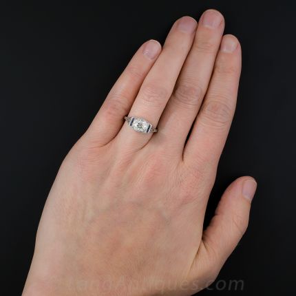 A stunning and sophisticated original Art Deco sparkler starring a bright and beautiful European-cut diamond, weighing .91 carats, collet-set between pairs of synthetic sapphire baguettes, atop a striking tonneau-shaped crown. Expertly hand- crafted in platinum - circa 1925, and appointed all around with decorative piercing, delicate milgraining, and hand-engraved details. A sleekly tailored classic, currently ring size 6 1/2. Accompanied with a GIA Diamond Grading Report stating: K color - SI1 clarity.
