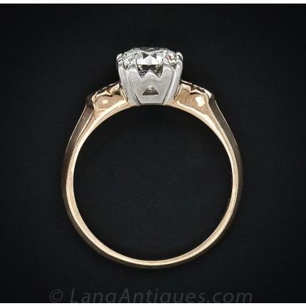 This two-tone 14K gold Mid-Century beauty features a brilliant .95 carat old European-cut diamond, "illusion" set in corner claw setting. A touch of sweetness is added with the floral detailing on the ring's shoulders.