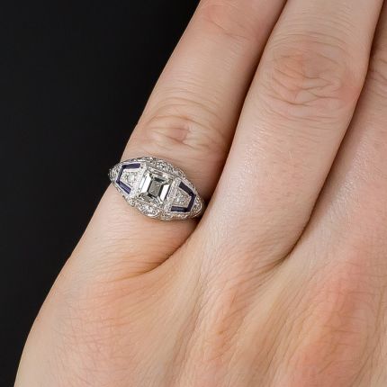A square beacon of light bracketed with an accent of calibre-cut synthetic sapphires (original to the ring and the period) shines forth from the center of this quintessential Art Deco diamond engagement ring. The diamond is accompanied by a GIA lab report grading the stone a J color and VS2 clarity. A scalloped edge of small diamonds and hand engraving finishes the original 1920s-30s vintage jewel. This ring is perfect for a small finger and its size 4 cannot be adjusted by much.