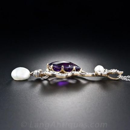 An elegant Edwardian amethyst, diamond, and freshwater pearl pendant features a rich, vivid amethyst surrounded by ribbons of diamonds. The pendant is topped by freshwater pearl and diamond fleur-de-lis and finished with a glowing freshwater pearl drop. This beauty is set in platinum over 18 karat yellow gold and suspended from an 18 inch platinum chain.