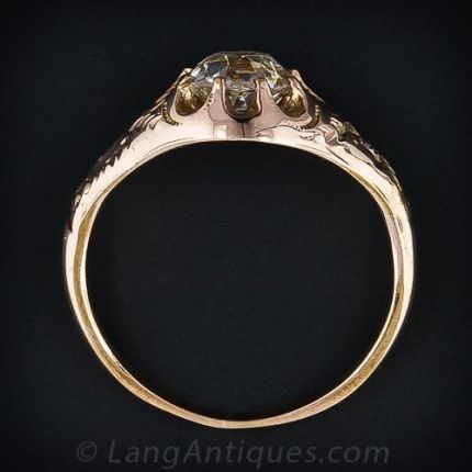 A bright and sparkling 1.15 carat old mine cut diamond is set in this wonderful antique rose gold mounting. The diamond is presented in a buttercup style mounting with repousse scroll work on the shoulders.