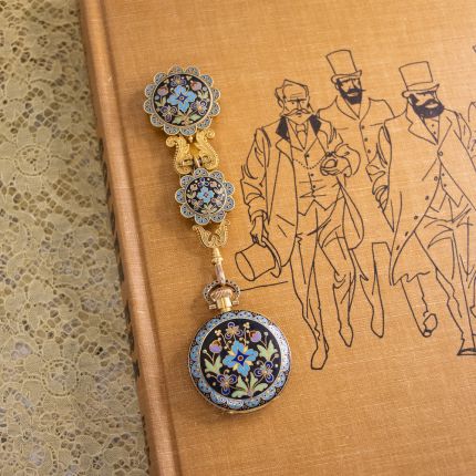 Unique and magnifique! This fabulous antique hunting case pocket/pendant watch, with a rare matching chatelaine, is ornamented on both sides in striking multi-color matte-finished cloisonné enamel. Hand fabricated in 18K yellow gold by Braverman & Levy, who, according to Starla, our intrepid in-house researcher, were early San Francisco jewelers who specialized in gold quartz jewelry from the mid-19th century Gold Rush period. After all these years away, we welcome it home! This utterly enchanting collectable measures 5 1/2 inches long. The timepiece measures 1 1/2 inches diameter. And check out the cool black and gold porcelain dial.