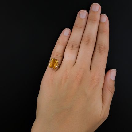 The gorgeous, gleaming golden hue of this 5.00-carat emerald-cut citrine is beautifully complemented by its bright rose gold mounting which bears a stylized arrow motif on the shoulders. Circa 1900. Hand fabricated in 10K gold, currently ring size 5 3/4.
