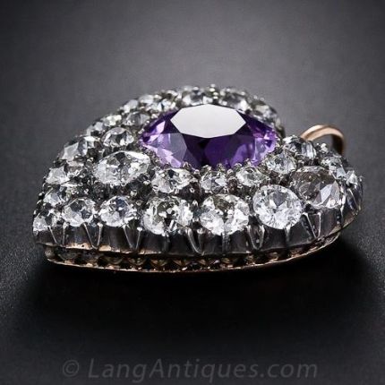 This no less than gorgeous Victorian heart pendant focuses on a lavender purple amethyst, which is happily nestled in the center of 2.75 carats of bright-white and sparkling old mine-cut diamonds. The slightly puffed heart is finely handcrafted in silver over gold, with the silver displaying a dark oxidized patina which effectively sets off the diamonds. This precious and romantic keepsake, circa 1870, measures 1 inch by 7/8 inch.