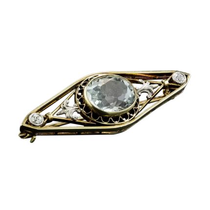 Brooches are truly the most versatile jewels; fastened to your lapel, scarf, hat, or even your hair, a well-placed brooch adds instant flair. This dainty, yet arresting, brooch by Charles Keller will do just that. Its open and airy curvilinear shape frames a glimmering, ultra-light blue 4.75 carat cushion-cut aquamarine surrounded by a scalloped design and accented east and west by platinum fleur de lys overlays. Two bright platinum-set European cut diamonds add a dash of sparkle. Hand fabricated in 14K yellow gold and platinum - circa 1900 - it measures 1 3/4 inches by 1/2 inch.
