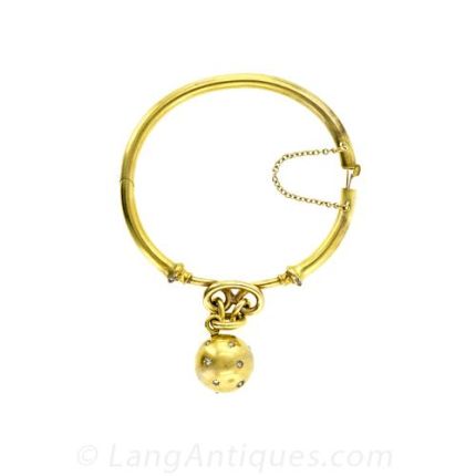 A delightful 18 karat yellow gold Victorian tubular bangle bracelet terminates in an ornamental knot design from which dangles a golden sphere scatterd with twinkling rose cut diamonds. Tiny rose cut diamonds also adorn the finials at the end of the tube bracelet. The bracelet has a soft, velvety, well earned patina.