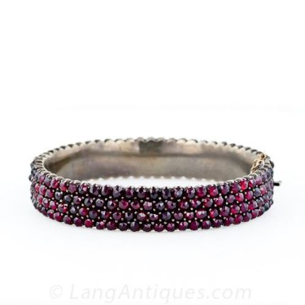From the late 1800s. An original and quite sturdy garnet bangle bracelet from Mittle-Europe (a.k.a. Eastern Europe) featuring five tightly set rows of burgundy garnets. The piece also features a vintage 14 karat yellow gold safety chain. Original patina, a classic.