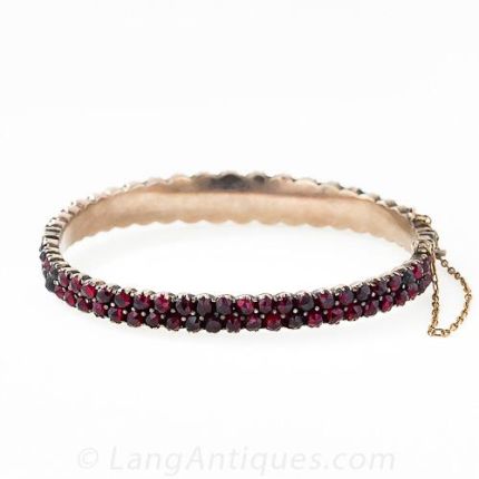 A classic, faceted garnet, hinged bangle bracelet by way of nineteenth century Central Europe. A double row of deep burgundy garnets gracefully taper all way round in this original and romantic antique beauty.