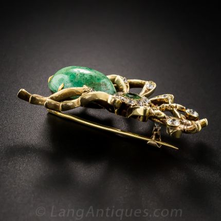 A big ( 1 11/16 by 15/16 inch) beautiful bug (a ground beetle we think), glistens and glows in the center with an electric lime green demantoid garnet from the Ural Mountains of 19th-century Russia. Its body isn't green turquoise (which we thought at first), but a big marbled opaque cabochon emerald, or green beryl! Small bright white, old mine-cut diamonds sparkle throughout this striking and very precious pest, crafted in 15ct. gold, hence most likely of Victorian British origin - circa 1890 -1900.