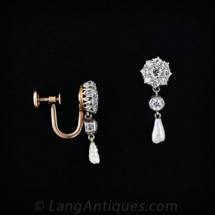 These sweet, petite and completely original, turn of the twentieth century diamond earrings (1.0 carat total) with a dangling freshwater wing pearl are simply delightful, let alone as rare as can be. Crafted in platinum over yellow gold, they have the original screw backs which can very easily be converted to posts.
