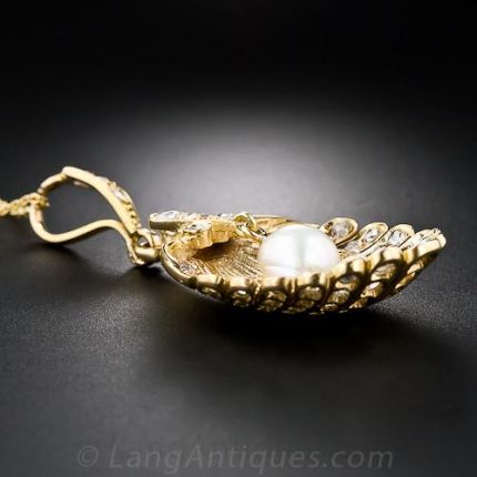 A shimmering freshwater pearl is served up on a glistening 18K gold and rose-cut diamond-set half shell in this unique, gorgeous and extraordinary antique diamond pendant, superbly rendered during the mid-19th century. This rare beauty measures just a smidgin shy of 2 inches long by 7/8 inch wide. This piece hangs from an 18 inch, 14 karat gold new chain.