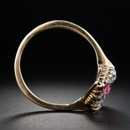 A long and lovely, antique diamond and ruby dinner ring, circa 1890. A center row of bright red Burmese rubies are embraced on both sides by a gentle curve of rose-cut diamonds in this original Victorian-era just-for-fun ring in 18 karat yellow gold.