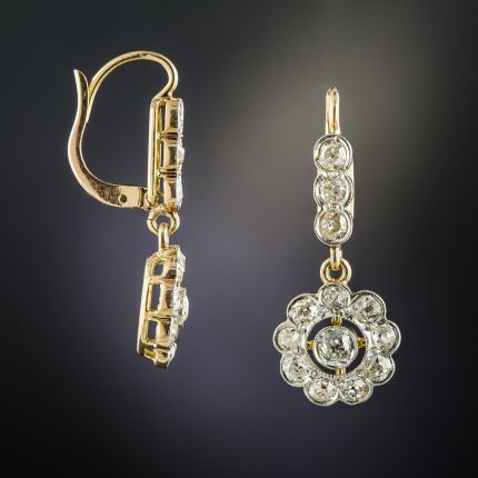 These classic diamond cluster drop earrings, hand fabricated in platinum over 18K yellow gold sometime during the early-20th-century, swing and sway and sparkle with an array of bright white and shining old mine-cut diamonds, together weighing 1.85 carats. 1-inch long, they drop a bit further from the lever back ear wires.
