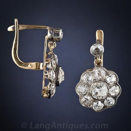 Rare, all-original, late-nineteenth century diamond earrings crafted in silver over 18 karat gold and sparkling madly with 2.50 carats of old mine-cut diamonds arranged in a classic cluster, or flower, design. 1/2 inch diameter, 3/4 inch long.