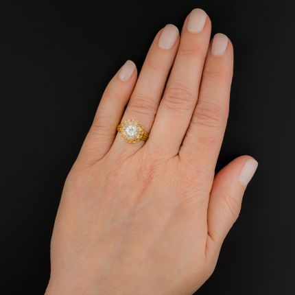 Few original classic Victorian-era cluster rings come as fine and fabulous as this ultra-sparkler starring a .56 carat old mine-cut diamond center stone closely encircled by 8 smaller antique cushion-cut diamonds, for a grand total of 1.31 carats of concentrated flash. The sizzling diamonds are outlined by 18K yellow gold buttercup settings supported by a striated tapered upper ring shank. A timeless tantalizer - circa 1890 -1900. Currently ring size 7.
