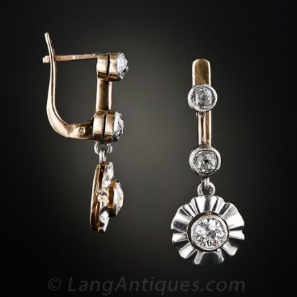 Darling and eminently wearable antique diamond drops dating from the turn-of-the-twentieth century. A pair of shining old mine-cut diamonds float in the center of freely swinging, silver-topped (over gold) skirted circular frames below a pair of smaller collet-set old mine diamonds. 13/16 inch.