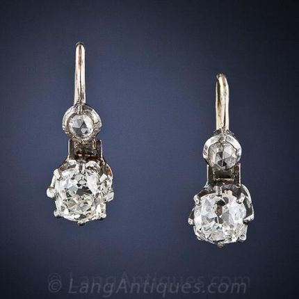 A bright and lively matched pair of antique cushion-cut diamonds, together weighing .90 carats (about .45 ct. each), dangle from a pair glistening rose-cut diamonds in these sweet and sparkling, very wearable and original, 1.00 carat total weight, 19th century earrings crafted in silver over gold.
