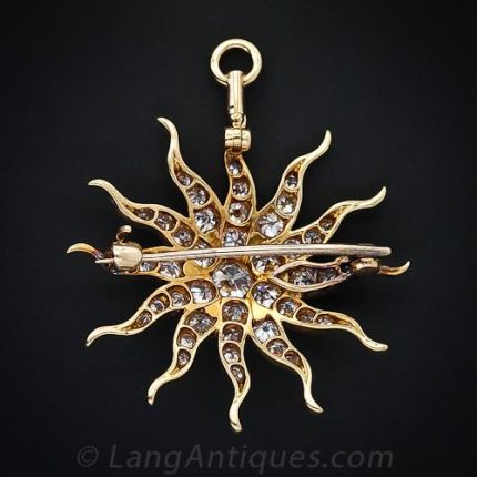 A celestial array of diamonds twinkle from this blazing and beautiful Victorian starburst in 18K yellow gold with forty high-quality, old mine-cut and European-cut diamonds adding up to two carats. A retractable bail allows this beauty to be worn as a pendant as well as a pin.