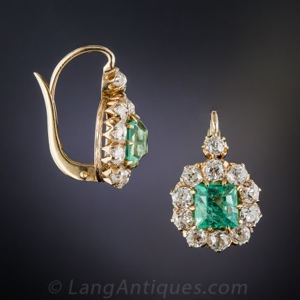 A beautiful matched pair of bright medium-light crystalline green old mine Colombian emeralds, together weighing 1.60 carats, glisten and glow from within sparkling white halos of old mine-cut diamonds in these wonderful, rare and radiant late-Victorian/Edwardian era jewels, hand-fabricated in 14K gold around the-turn-of-the-last-century. They drop just shy of 3/4 inch. Of all gemstones, emeralds don't photograph particularly well. They are much more beautiful unmagnified and in person.