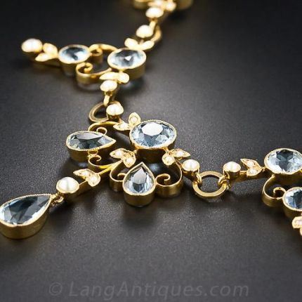 Over six carats of shimmering, pastel aquamarines are celebrated in scrolling, leafy garlands dotted with delicate pearls in this enchanting turn-of-the-century necklace from England. Masterfully hand-fabricated in 15 karat gold, this romantic treasure at some point has been plated in rich 22 karat gold to enhance its beauty. Measures 16 inches long.