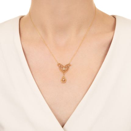 Fanciful delicate filigree adorns a stylized heart-shaped top and a dangling teardrop, each centered with a small sparkling white European-cut diamond, in this sweet and lovely lavalière necklace dating back to the turn-of-the-20th-century. Hand fabricated in 14K gold. Chain measures 16 1/2 Inches, total necklace length including the width of the pendant 11/16 Inch.