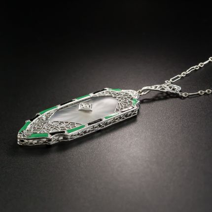 From its uncommon bullet shape to the striking green and black enamel that surrounds it, this frosted rock crystal quartz Art Deco pendant stands apart from most that we've seen of this era (circa 1930s). Embellished north and south with light and lacy filigree, its center is accented by a single twinkling diamond and it suspends from a decorative bail which joins to an 18-inch Figaro chain. Rendered in 14K white gold.