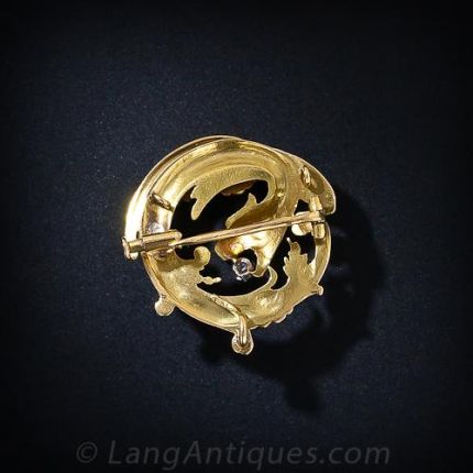 A fierce golden griffin with a bite-size old mine-cut diamond in its jaws is wonderfully captured in this French Art Nouveau treasure which may be worn as a pendant, alone as a pin, or to support a ladies pendant watch. A beauty.