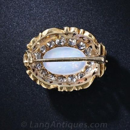 From nineteenth-century France comes this exquisitely beautiful, and modestly proportioned, brooch highlighting a luminous pastel-colored opal surrounded by fifteen glistening old mine-cut diamonds weighing a total of one carat. The majestic 18 karat gold frame is imbued with superlative handcrafted open scrollwork. Thoroughly lovely. 7/8 inch by 11/16 inch.