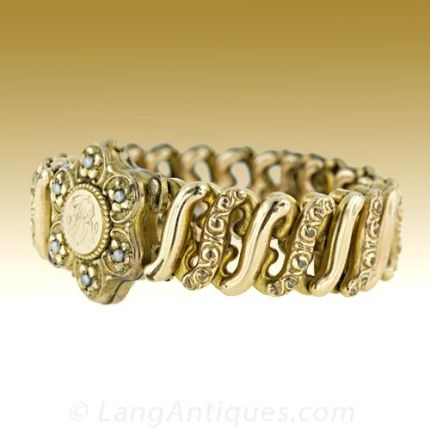 A charming Victorian expansion bracelet with a functional floral motif locket center set with tiny natural grey and white pearls. Sweet.