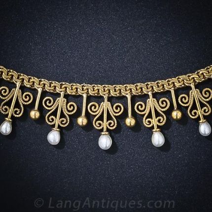 One of the sweetest and most delightful antique pearl necklaces you'll ever see. Delicately crafted in 14 carat yellow gold graceful filigree scrolls, each with a tiny shimmering natural pearl, alternate with a tiny bead section. The necklace was cleverly made with two clasps which allow the necklace to be worn at either 16 3/4 or 14 1/2 inches. A darling, romantic feminine treasure, circa 1880.