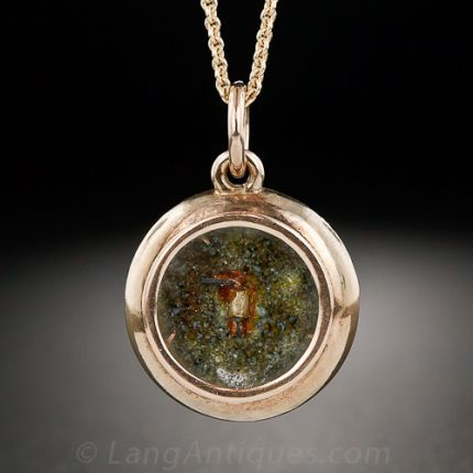 A colorful Christmas ornament for all year 'round. A sweet and petite disc locket, crafted in 18K gold and adorned on the top with bright-green guilloche enamel centered with a small lustrous pearl and orbited by golden stars. The reverse is equipped with a round glass bezel locket in which to display a memento of a loved one. 5/8 inch, 24 inch 14K fine Italian chain.