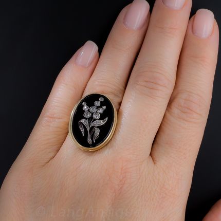 A glittering bouquet of rose-cut diamonds, set in silver, is dramatically set-off against a bright black onyx background in this chic and sizable (1 inch by 3/4 inch) 6.75 bauble, sturdily hand crafted 10K yellow gold. A unique vintage beauty.