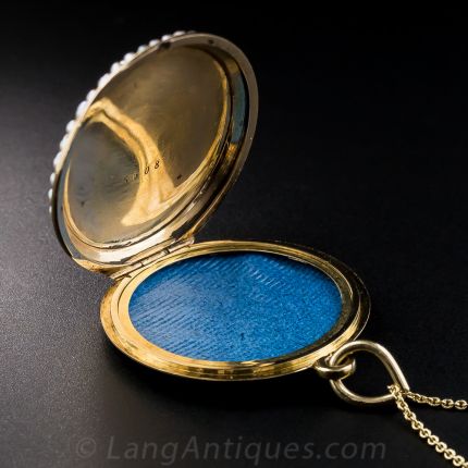 You have to look close to notice the tiny cabochon rubies glowing between each lustrous half-pearl in this fabulous 1 and 1/8 inch round locket, meticulously and patiently hand-fabricated in 18K gold around the-turn-of-the-last-century when the cost of labor was nominal. Imagine what this would cost to make today if you could find a capable jeweler! A rare and beautiful conversation piece. 18 inch chain.