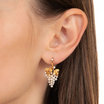 Fine wine doesn't grow on trees, it comes from leafy vines with succulent grapes such as those artfully depicted (twice) in these charming grapevine earrings, realistically hand fabricated in finely textured 18K yellow gold with clusters of lustrous white seed pearls. Sweet and lovely, they date back to the latter-1800s/turn-of-the-20th-century.