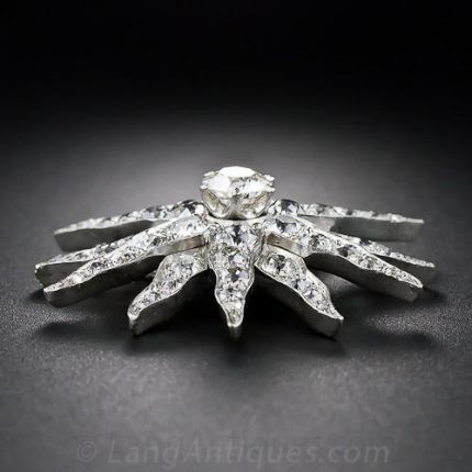 Three carats of bright-white and beautiful old mine-cut diamonds join forces in this celestial beauty formed of overlapping rays and handcrafted in platinum around the turn-of-the-twentieth century. A masterfully engineered removable pin mechanism allows it to be worn as a pendant. Stellar! 1 1/4 inches.