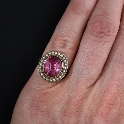 A foil-backed colorless cabochon quartz, surrounded by natural seed pearls, reflects what remains of the original red coloration resulting in an intriguing and shimmering glow in this rare and wonderful mid-nineteenth century bauble. 11/16 inch high by just under 9/16 inch wide. Please note that this ring cannot be sized. Size 4.