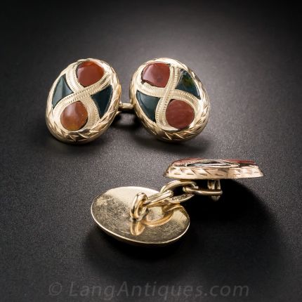 From late Victorian England or Scotland, a relatively small (5/8th inch by 7/16th inch) but striking pair of double sided cuff links, crafted and hand engraved in 9K rose gold, inlaid with bloodstone and jasper agate. Scottish chic!
